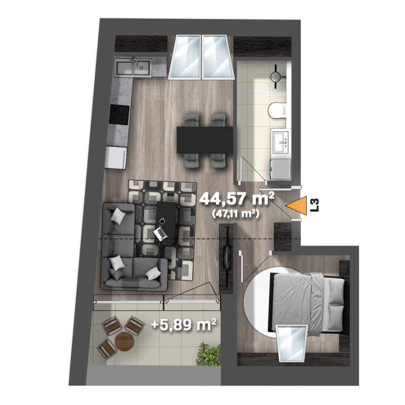 44,57 m² (47,11 m²)