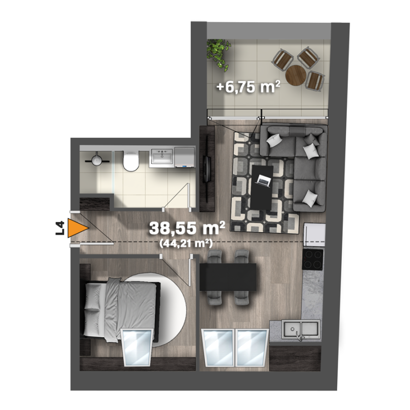 38,55 m² (44,21 m²)