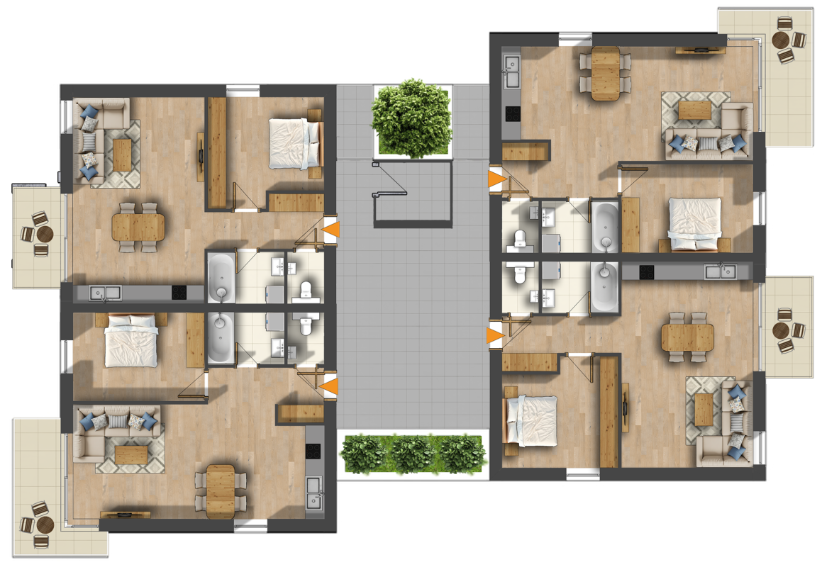 A 4db lakást a közöttük lévő fedett- nyitott közlekedő kapcsolja össze, ezzel fokozva a lakások egymástól való elkülönítését, „Különálló ház” élményét.