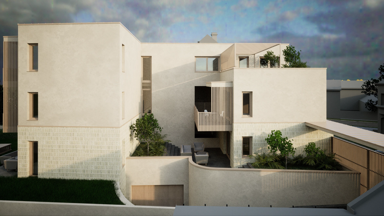 A 4db lakást a közöttük lévő fedett- nyitott közlekedő kapcsolja össze, ezzel fokozva a lakások egymástól való elkülönítését, „Különálló ház” élményét.